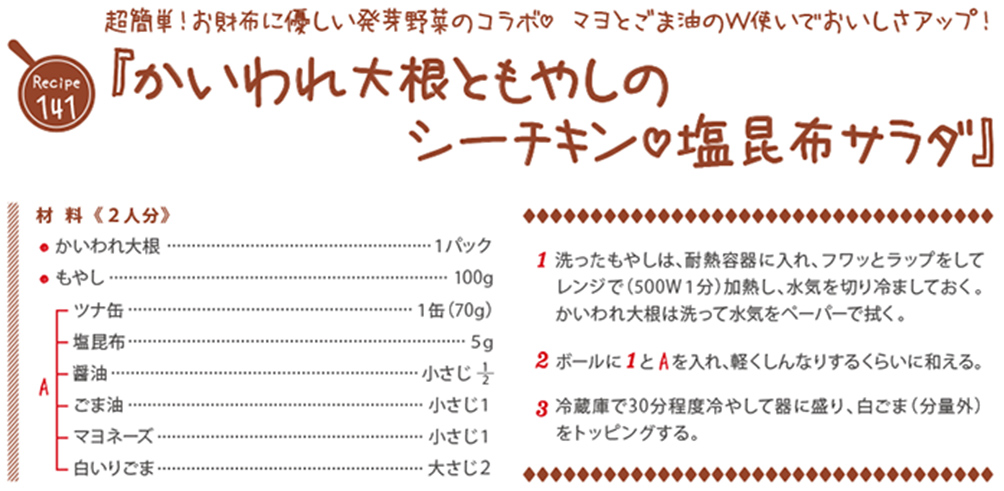 『かいわれ大根ともやしのシーチキン♡塩昆布サラダ』のレシピをご紹介!