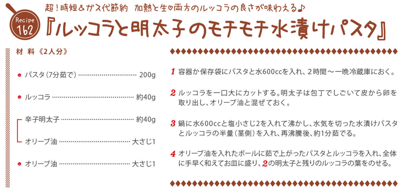 『ルッコラと明太子のモチモチ水漬けパスタ』のレシピをご紹介!