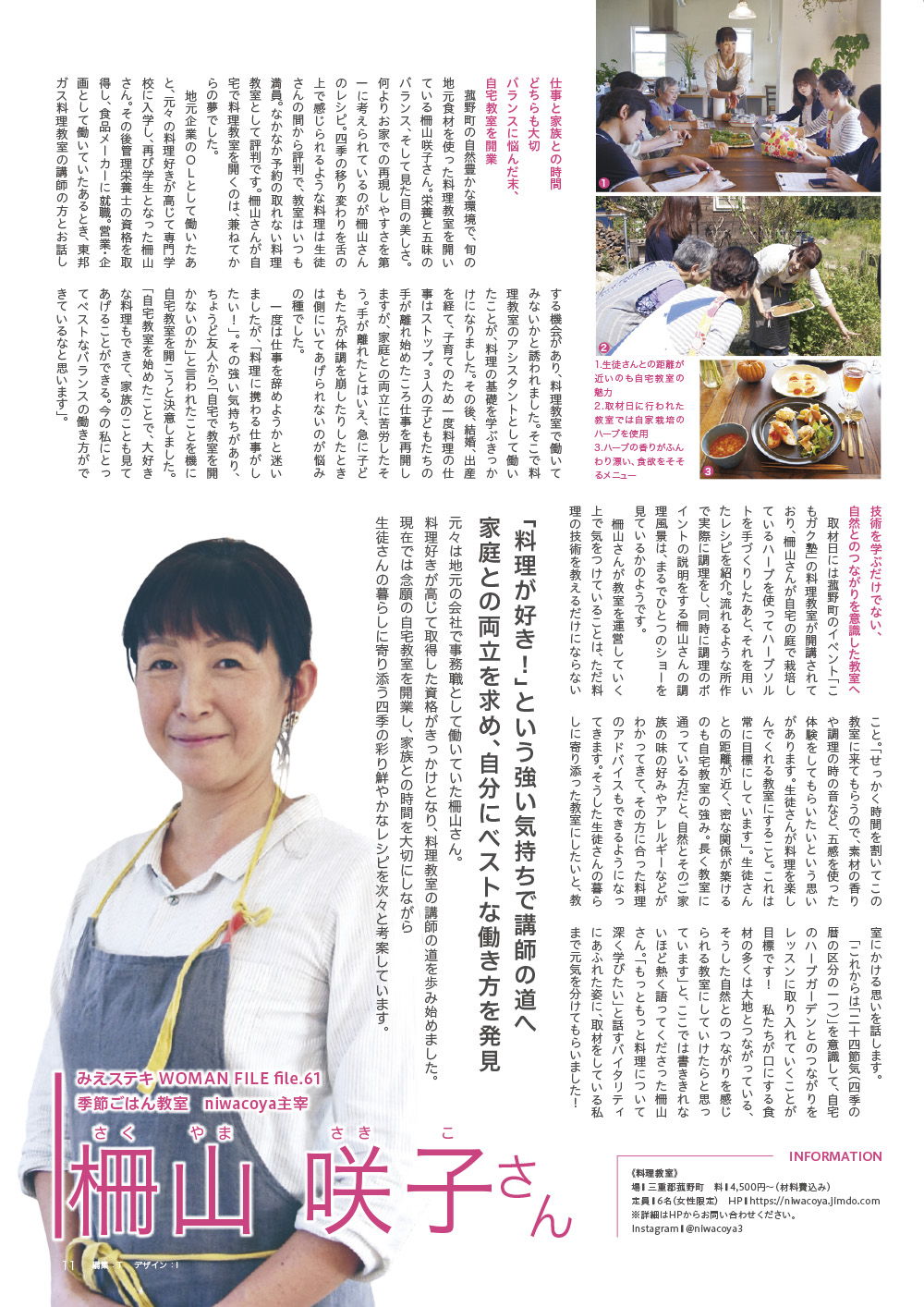 freeK98(11月号)の「みえステキWOMAN FILE ~file.61~」では、季節ごはん教室 niwacoya主宰 柵山咲子さんをご紹介。