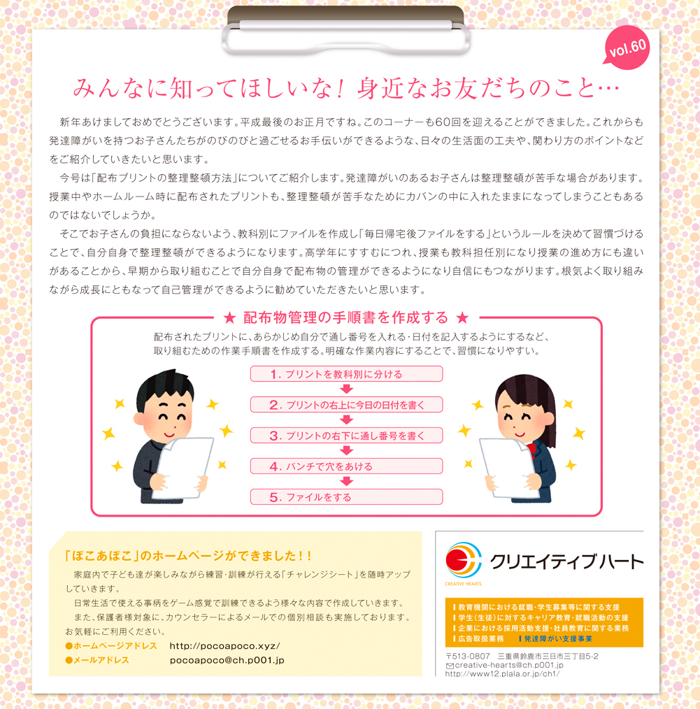 freeK100号(2019年1月号)の「みんなに知ってほしいな!身近なお友だちのこと… 」は、「配布プリントの整理整頓方法」。
