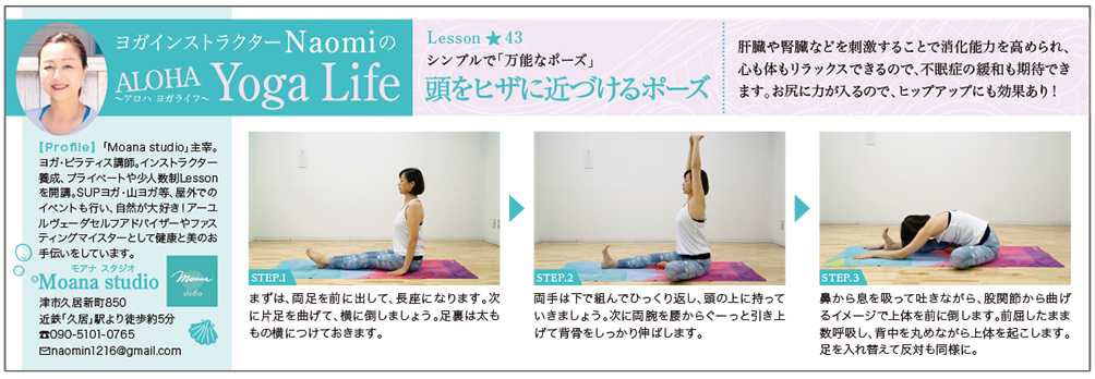 freeK Vol.140(5月号)の「ヨガインストラクターNaomiのALOHA Yoga Life(アロハ ヨガライフ)」では、「頭をヒザに近づけるポーズ」についてご紹介します!
