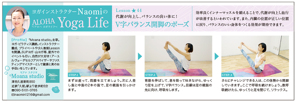 freeK Vol.141(6月号)の「ヨガインストラクターNaomiのALOHA Yoga Life(アロハ ヨガライフ)」では、「V字バランス開脚のポーズ」についてご紹介します!