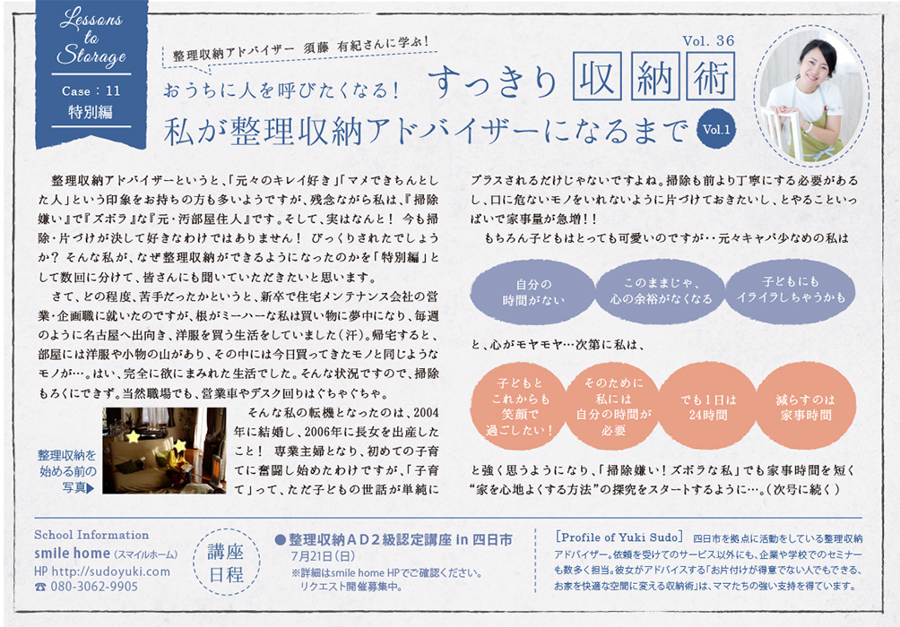 今月からは特別編として、須藤さんが整理収納アドバイザーになるまでの過程のお話を紹介!自分を変えられる勇気と行動力は見習わなきゃと思いました!