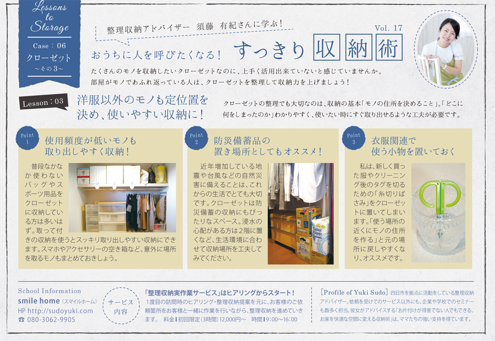 freeK111号(2019年12月号)の整理収納アドバイザー 須藤 有紀さんに学ぶ! 「すっきり収納術 vol.17」。クローゼットの第3回目は、よりそのスペースを有効的に使える方法と豆知識を紹介。これから必須になる防災に役立つ情報もあるので、要チェック!!