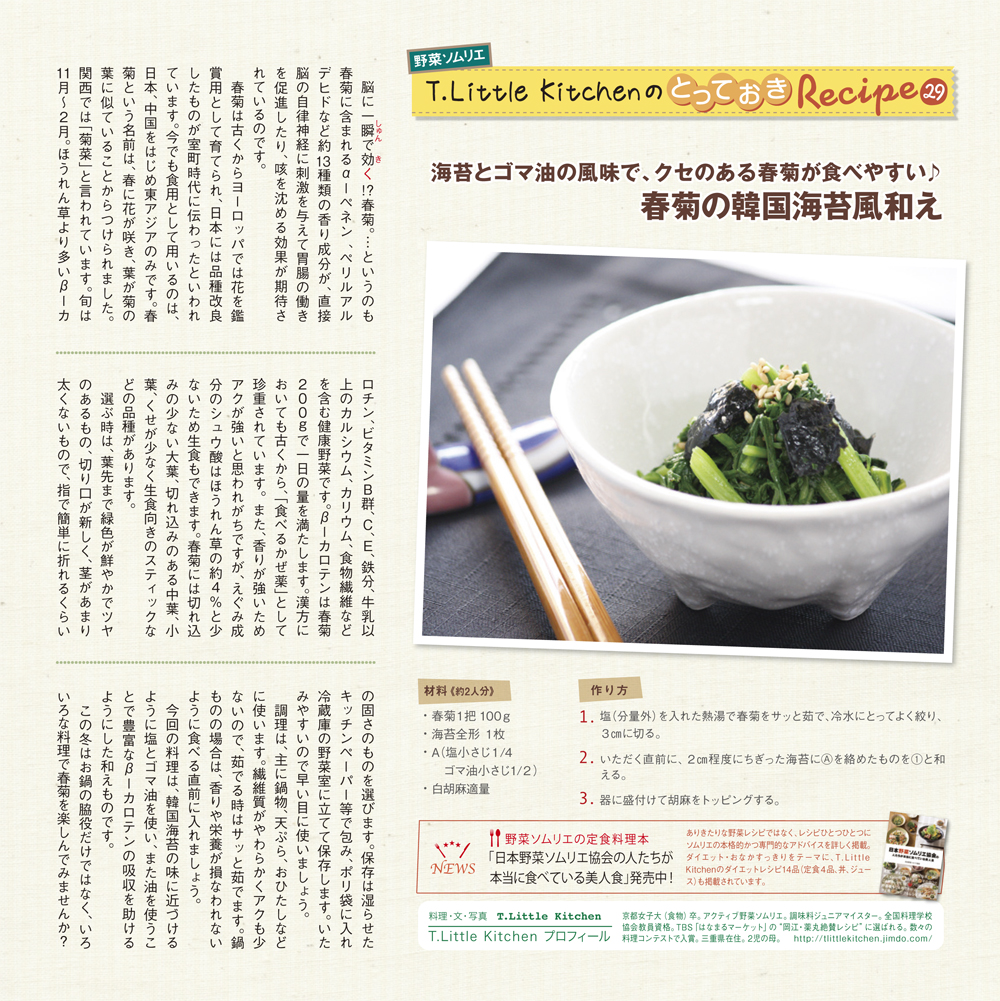 freeK28(2013年1月号)の野菜ソムリエプロ T.Little Kitchenさんの「とっておきレシピ」をご紹介。