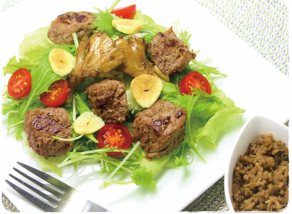 「牛肉のコロコロステーキ♡サラダ風☆マイタケソースを添えて」のレシピをご紹介!