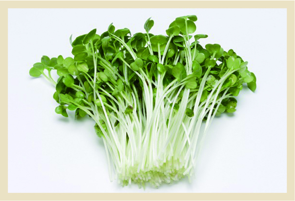 ピリッとした清涼感が特徴の新芽野菜の代表選手「かいわれ大根」。大根の新芽ですが、2枚貝が開いたように見えることでこの名がつきました。平安時代から食されていたといわれ、古くは地植えの高級食材でしたが、1960年代に水耕栽培が開発されて室内での大量生産が可能となり、身近なものとなりました。辛み成分のイソチオシオネートには強い抗酸化作用があり、抗がん作用が期待されています。種の時には含まないビタミンCなどの栄養が発芽により合成されますが、生でいただくことでこれらの栄養の損失を防げます。加熱するときは短時間で、栄養が溶け出した汁もいただける料理にしましょう。また、骨の形成を助けるビタミンKやカロテン、ビタミンEは脂溶性のため、油を使うことで吸収力がアップします。