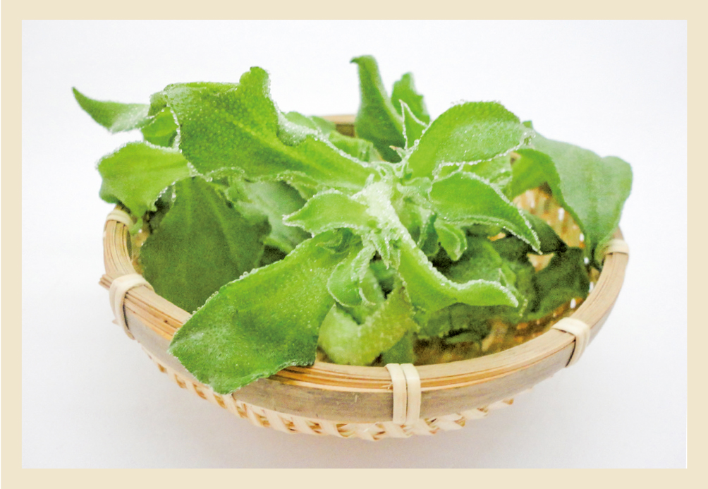 キラキラ!と水晶のような細かい水泡が表面に光る新顔野菜「アイスプラント」。噛むとほんのりと塩味と酸味がします。水泡に水、カリウム、マグネシウム等を貯えるのは、砂漠地帯の多肉植物であるアイスプラントの知恵です。日本での野菜化は1985年に佐賀大が有明海の塩害対策で、塩分などのミネラルを吸収しやすいアイスプラントを研究、栽培したのが始まりです。特有の「ミオイノシトール」が脂質、糖の代謝を調節し、生活習慣病予防が期待されています。プチプチ食感を楽しむには生が一番!クセがなく、塩味と酸味があるためドレッシングなしでもОKで、サンドイッチの具や納豆にも。加熱すると粘りが出てプチプチ食感は減りますが、天つゆいらずの塩味天ぷら、しゃぶしゃぶなどに。ヨーロッパでは古くから食され、フランス料理でよく利用されています。地物コーナー等で見かけたらぜひ一度お試しを♪