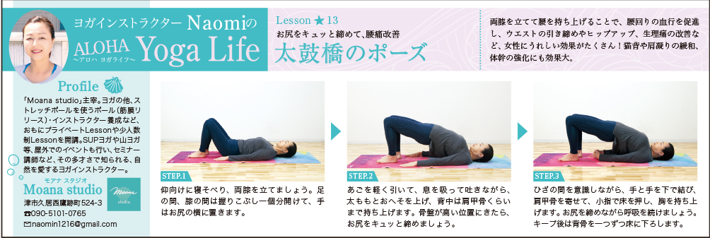 freeK103号(4月号)の「ヨガインストラクターNaomiのALOHA Yoga Life(アロハ ヨガライフ)」では、腰痛改善や肩凝りの緩和に効果大!「太鼓橋のポーズ」をお教えします!