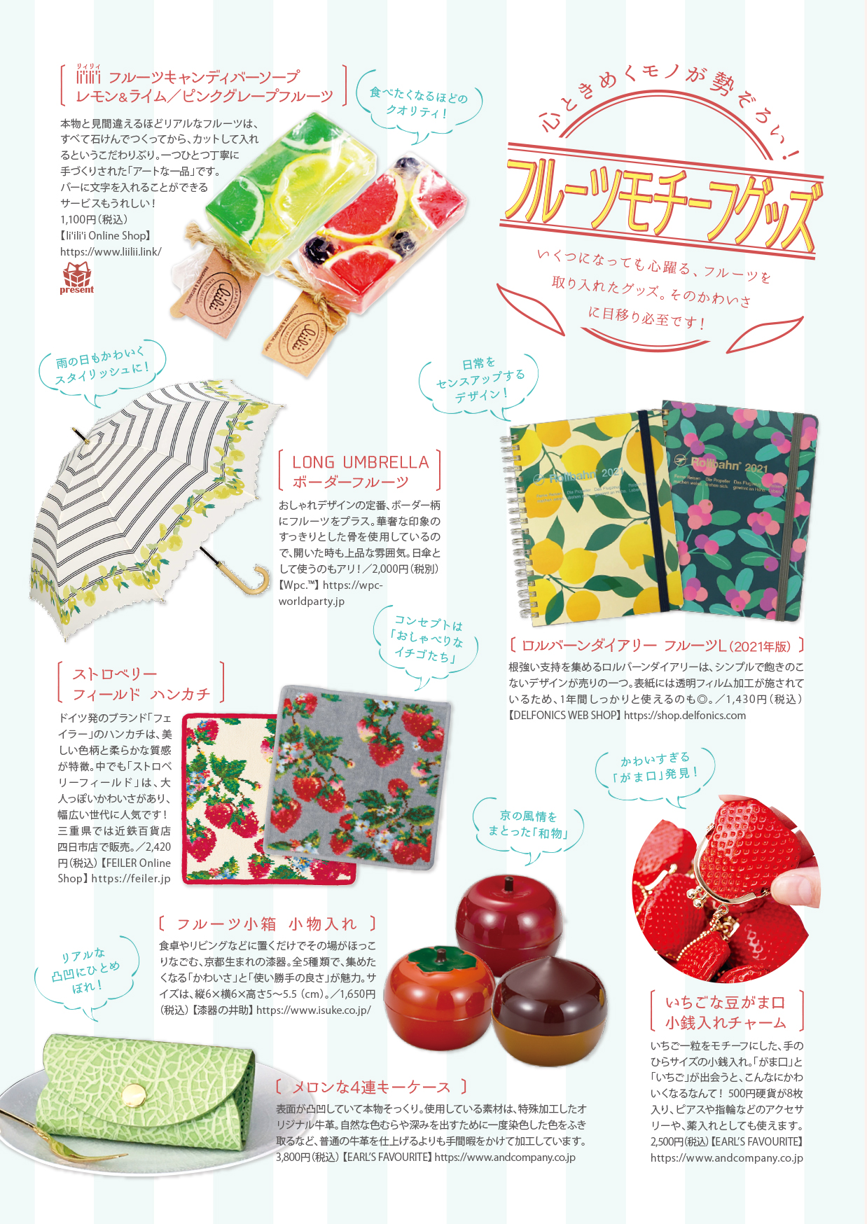 フルーツモチーフグッズと、彩り豊かなページが並び、