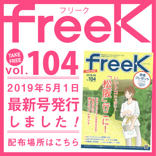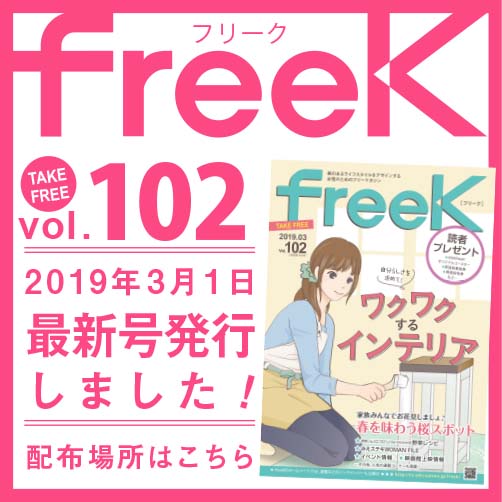 freeK Vol.102を発行いたしました。 今回の特集は「ワクワクするインテリア」です! 今回の特集は新生活シーズンにおすすめのインテリア情報のほか、 これからの時期見頃を迎える三重県の桜スポット紹…