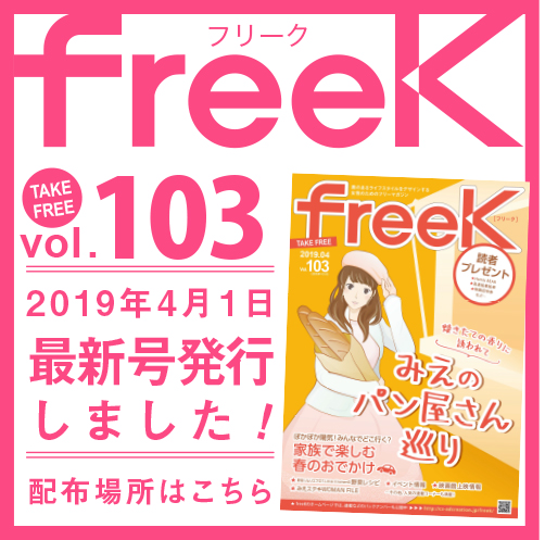 freeK Vol.103を発行いたしました。 今回の特集は「みえのパン屋さん巡り」です!県内の人気のパン屋さんを13店舗厳選。惣菜パンと菓子パンのカテゴリーに分けて、そのお店ならではのパンたちの魅力を紹介していま…