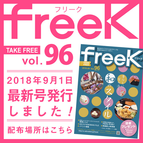 freeK Vol.96を発行いたしました。 今回の特集は「和のスタイル」。 日本人の心の原点に触れられるさまざまな「和」の世界へご招待します。 〜 freeKの配布…