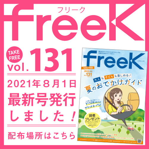 freeK Vol.131を発行いたしました。 今月の特集は「夏のおでかけガイド」! 今号最大の見どころは,7月にグランドオープンした 「VISON」の特集。 この記事を読んでから、現地に行ってみよう!! ほか…
