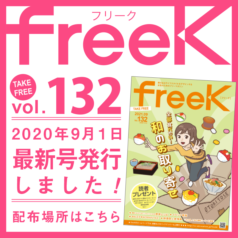 freeK Vol.132を発行いたしました。 今月の特集は「和のお取り寄せ」! このご時世で急きょ特集内容を変更。 今号も無事発行できたことに感謝です。 〜 freeKの配布先・設置場所は、 ショ…