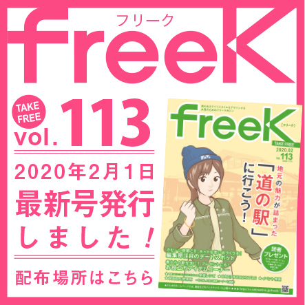 freeK Vol.113を発行いたしました。 最近の「道の駅」はどんどん進化中!!取材をしていても、おいしいグルメ&魅力的なおみやげいっぱいでした!!県内のデートスポット情報もおすすめ! 〜…