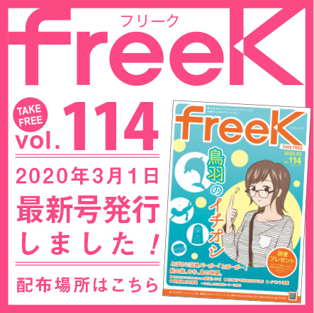 freeK Vol.114を発行いたしました。 今月は、鳥羽特集!!鳥羽といえば水族館ですが、今回はその人気スポット以外のおすすめを紹介!イルカ島や展望台、海の博物館などのスポットや、とばーがーや離島の魅力も紹介しています!! …