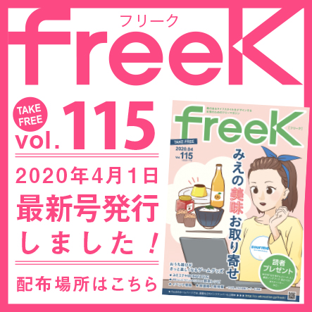 freeK Vol.115を発行いたしました。 freeKもコロナウイルス対策で、急遽予定を変更! 「おうちにいる時間」を少しでも楽しんでもらえるような内容に^^ 三重のお取り寄せ情報を徹底的に調査しました!! 「みえステキ…
