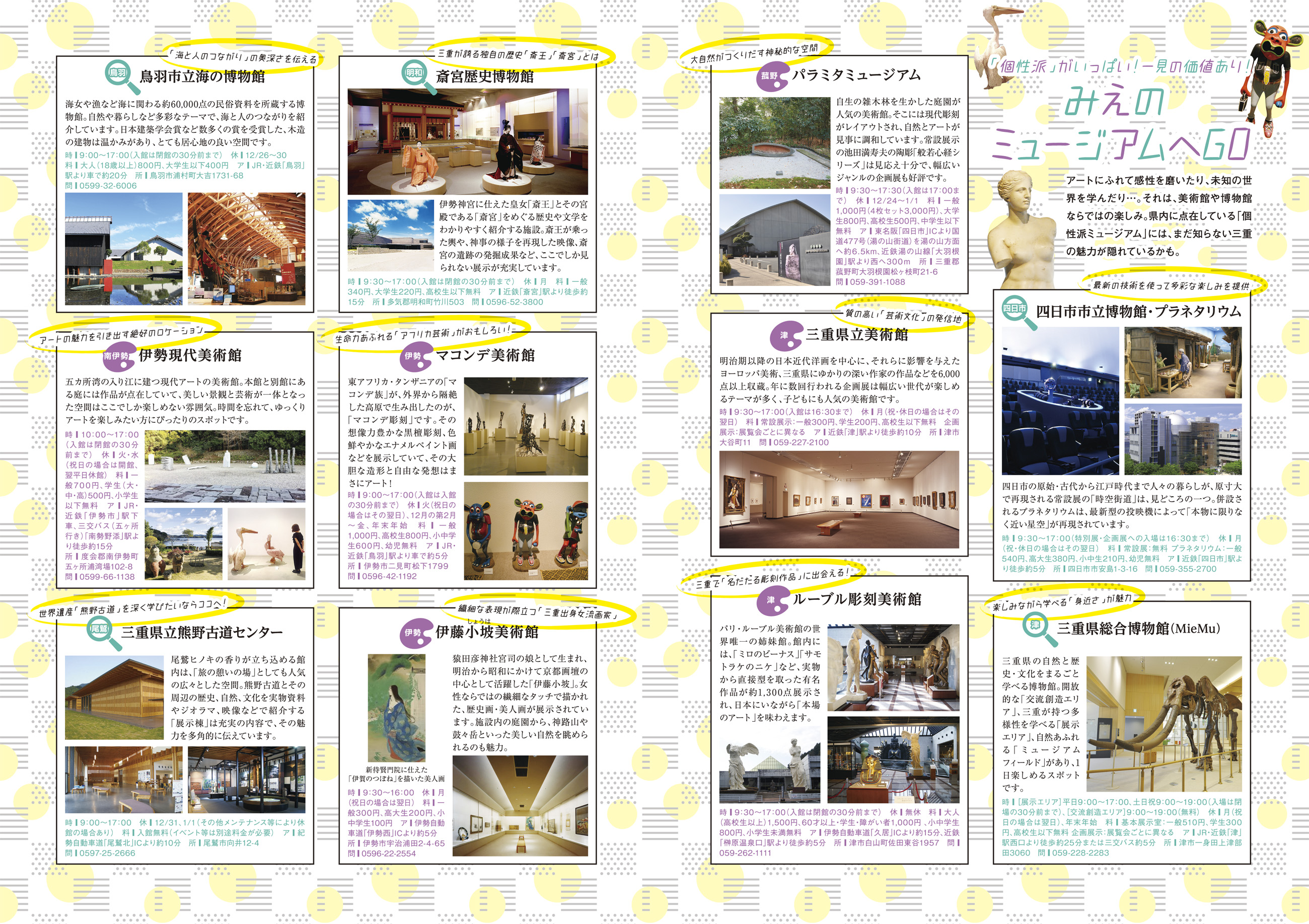 今号の特集ページは、「みえのミュージアムへGO」。アートにふれて感性を磨いたり、未知の世界を学んだり…。それは、美術館や博物館ならではの楽しみ。県内に点在している「個性派ミュージアム」には、まだ知らない三重の魅力が隠れているかも。