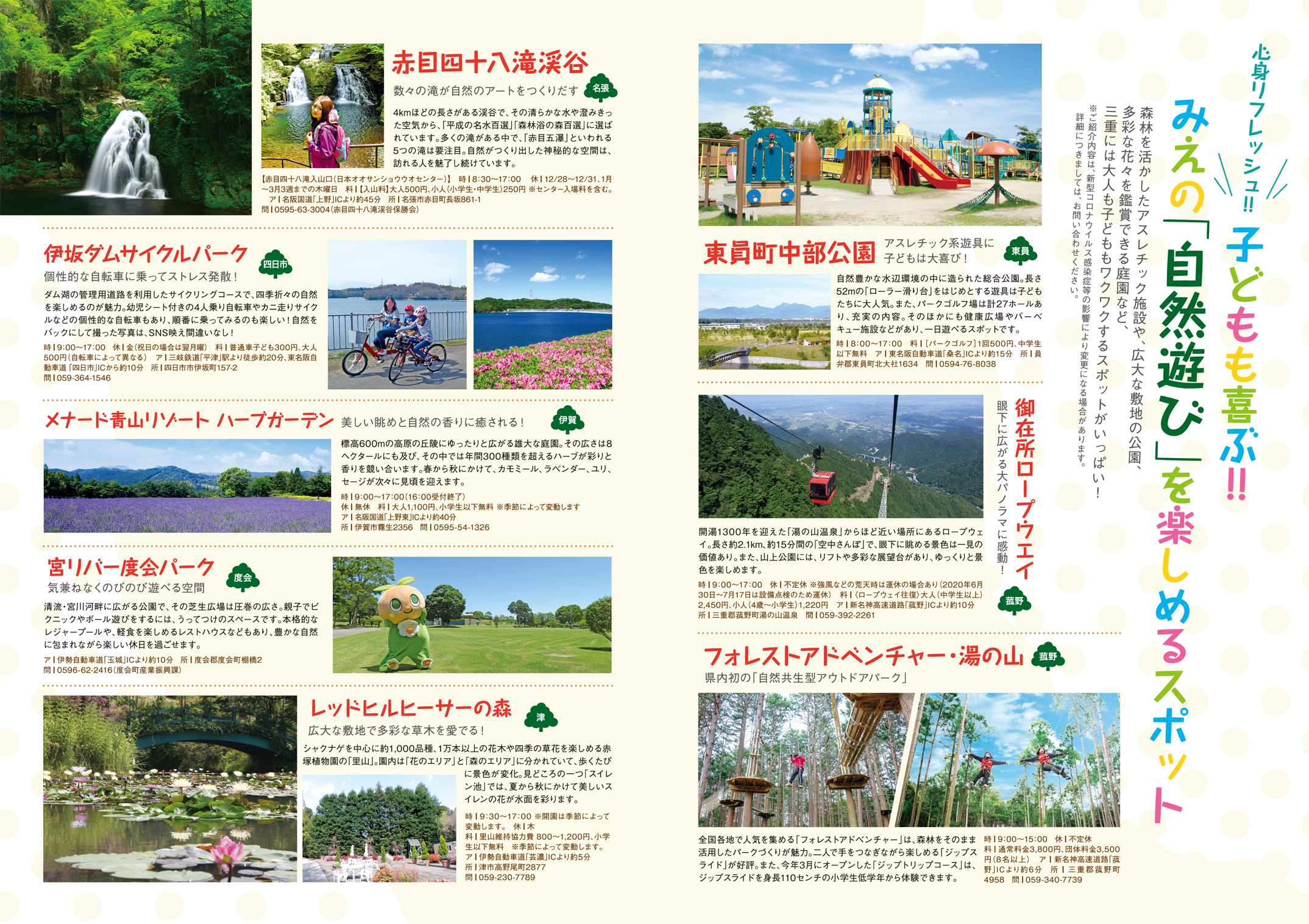 今号の特集ページは、「心身リフレッシュ!!子どもも喜ぶ!!みえの「自然遊び」を楽しめるスポット」