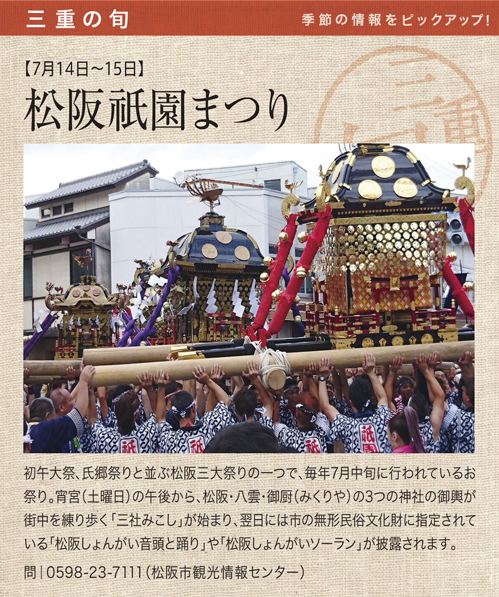 みえなび+ Vol.17(2018年7~8月号)の「三重の旬」コーナーでは、「松阪祇園まつり」をご紹介。